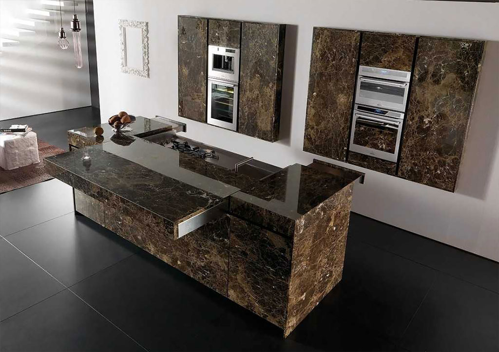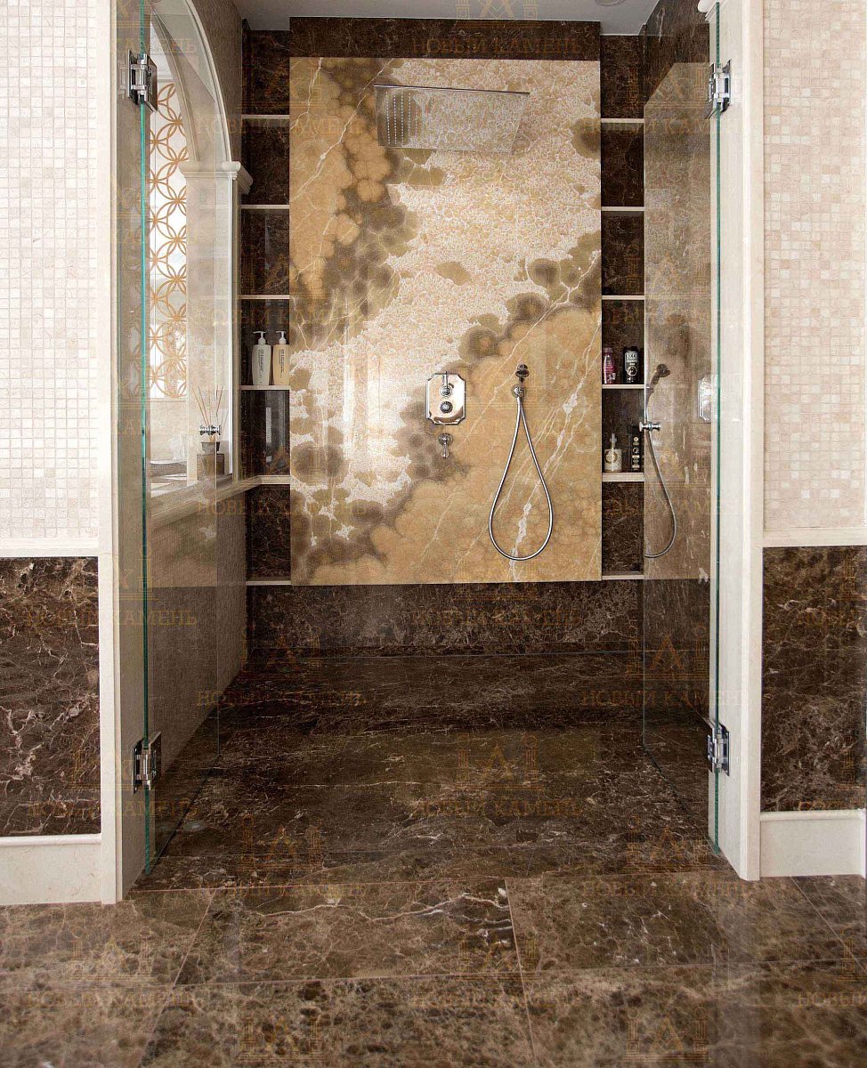 Полированный мрамор Dark Emperador — это насыщенный коричневый цвет с контрастными белыми и бежевыми прожилками. Создает богатый, солидный и теплый акцент в классических и современных интерьерах.