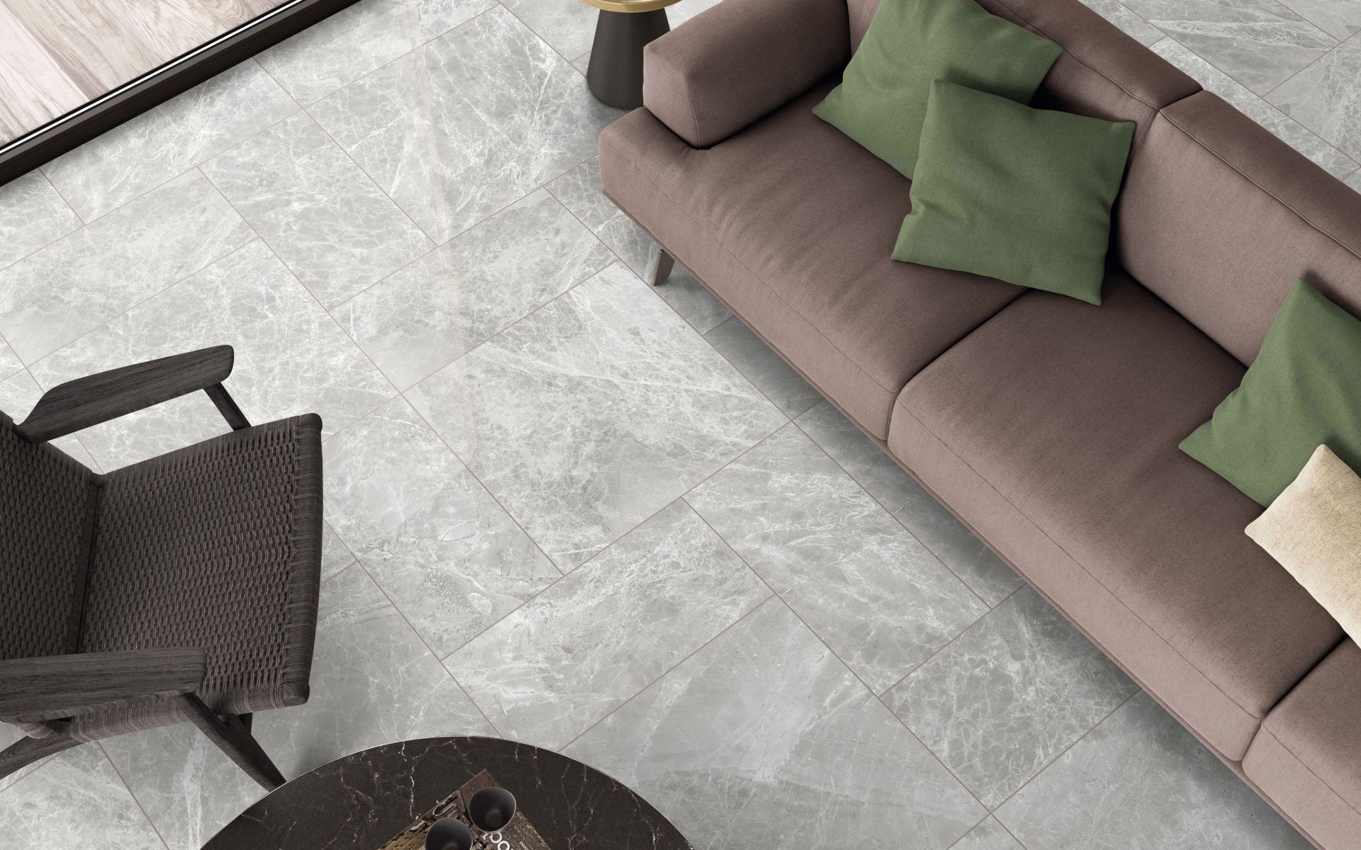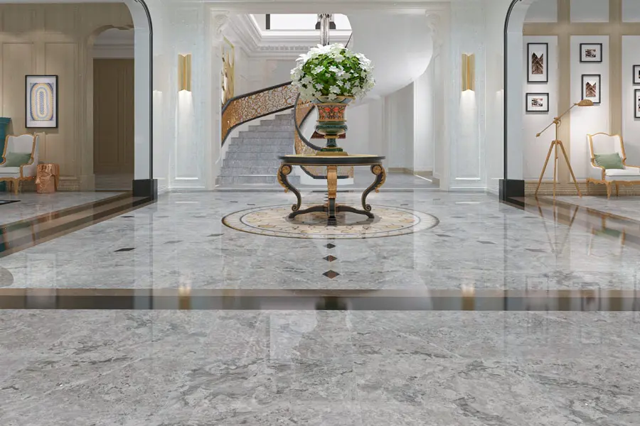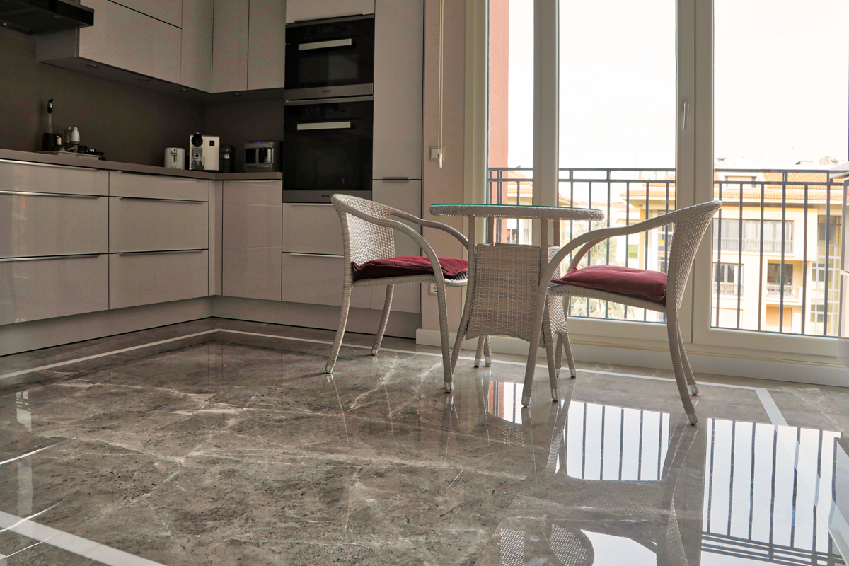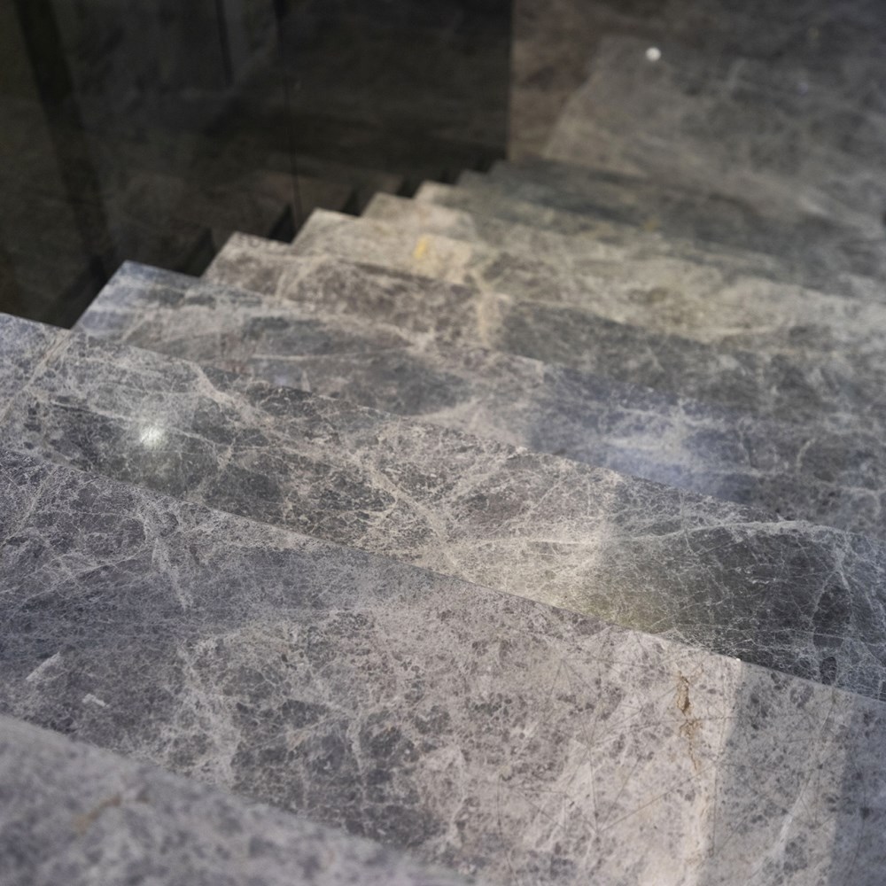 Полированный камень Tundra Grey (Серая Тундра) передает цвета и ощущения северных ландшафтов: холодные оттенки серого с вкраплениями белого и черного. Строгий и аутентичный.