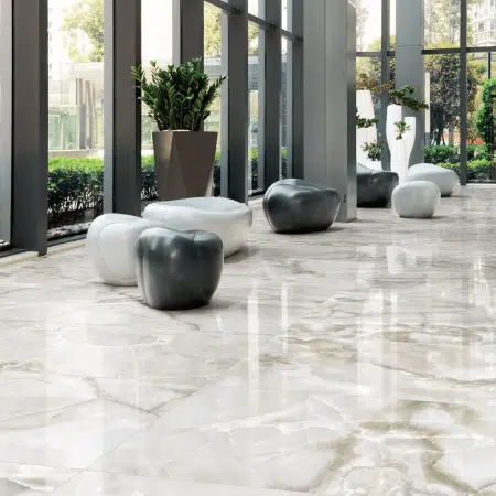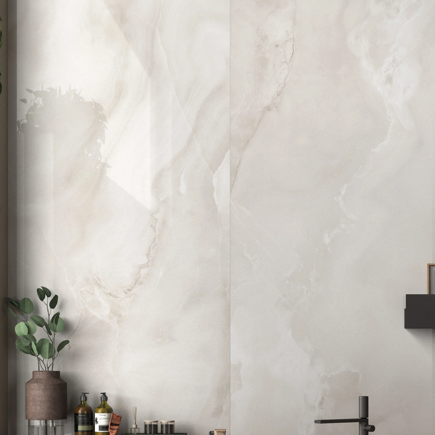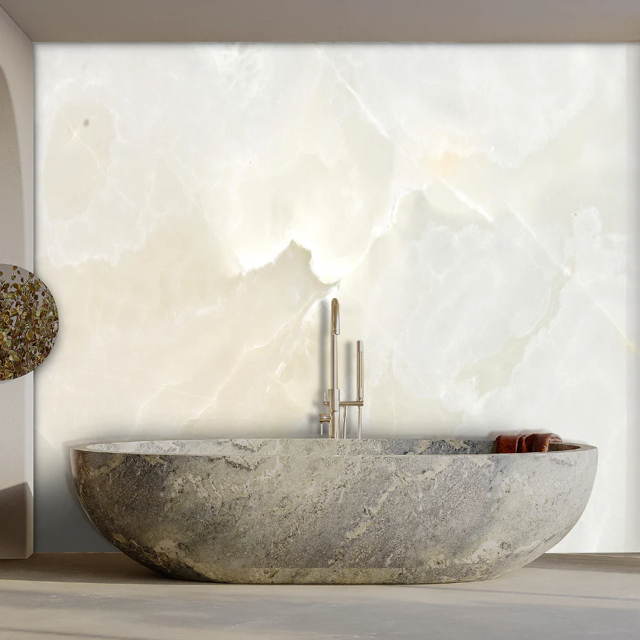 Полированный белый оникс — это эталон роскоши и изысканности. Его полупрозрачные слои кремового и белого цвета создают непревзойденный эффект внутреннего свечения при подсветке.